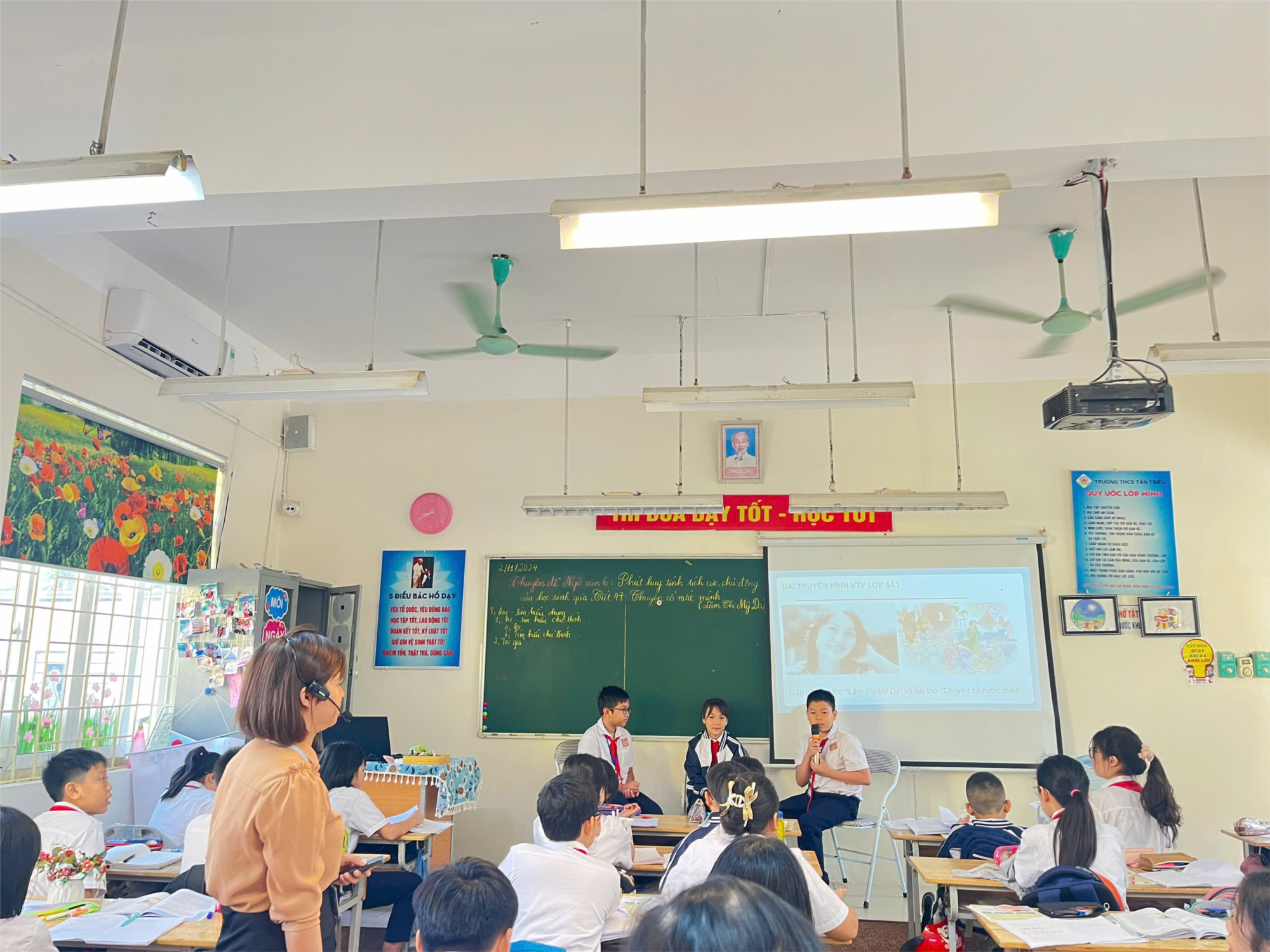 Đặc biệt, với phương pháp sắm vai và phương pháp chuyên gia, các em học sinh được bước vào thế giới sống động, kì thú của các câu chuyện cổ - thế giới của trí tưởng tượng bay bổng, kì ảo… Bằng những hình thức tổ chức hoạt động dạy học linh hoạt như tổ chức cho học sinh chơi các trò chơi, làm việc theo nhóm,… cô giáo Ngọc Lan đã giúp học sinh lĩnh hội kiến thức, phát huy được năng lực giao tiếp và hợp tác, sự chủ động và tích cực trong học tập. Từ đó bồi dưỡng cho học sinh về tâm hồn, tình cảm, tư tưởng: biết nhận thức cái đúng, cái sai, cái tốt, cái xấu, cái thiện cái ác…; biết đấu tranh cho lẽ phải, công bằng; học tập những phẩm chất cao quý từ các nhân vật trong truyện dân gian.