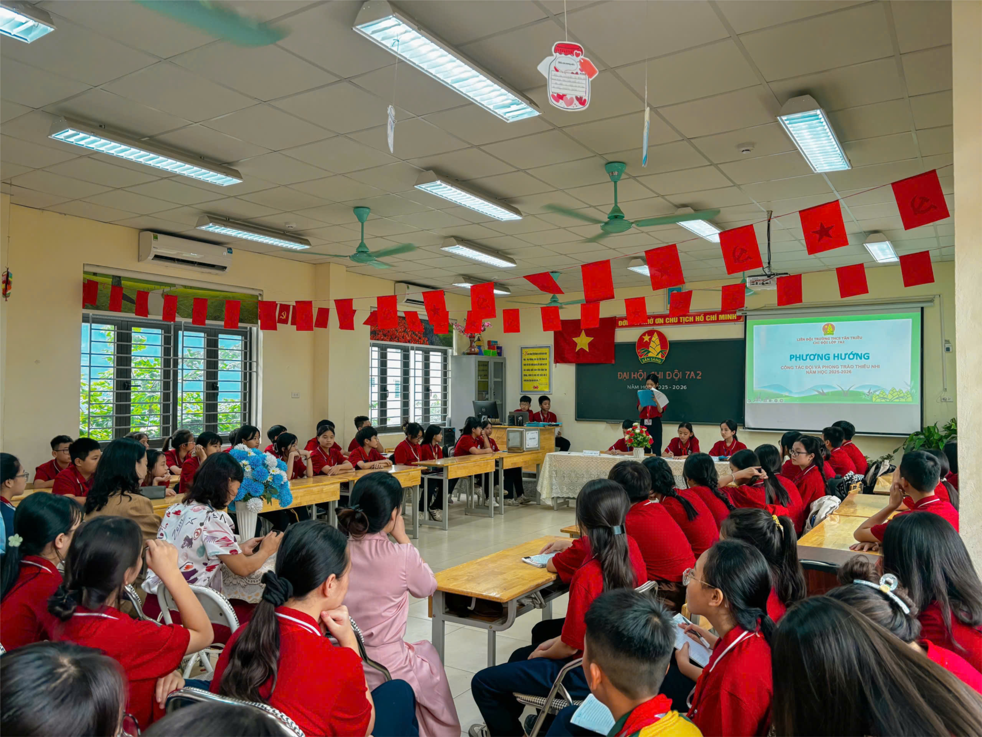 Đại hội có sự tham dự của 32/33 đội viên ưu tú đại diện các chi đội và toàn thể học sinh lớp 7A2 – một tập thể tiêu biểu về nề nếp, tinh thần trách nhiệm và tính sáng tạo trong hoạt động Đội. Đại hội diễn ra trang trọng, nghiêm túc nhưng cũng đầy sôi nổi, trẻ trung. Các bạn đội viên đã cùng nhau lắng nghe báo cáo tổng kết nhiệm kỳ 2024-2025, nhìn lại những thành tích đáng tự hào, đồng thời thảo luận và đóng góp ý kiến cho phương hướng nhiệm kỳ 2025-2026. Nhiều tham luận ý nghĩa đã được trình bày, xoay quanh các chủ đề gần gũi và thiết thực: rèn luyện đạo đức, nâng cao chất lượng học tập, xây dựng tập thể Đội vững mạnh, đẩy mạnh các hoạt động văn hóa – văn nghệ – thể dục thể thao… Từng ý kiến đều thể hiện trách nhiệm và niềm mong muốn được đóng góp công sức vào sự phát triển chung của chi đội.