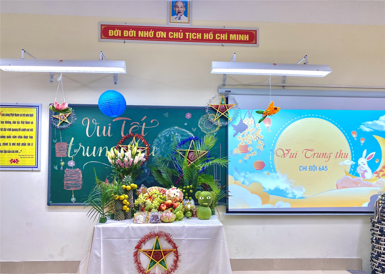 Bên cạnh những sản phẩm như đèn lồng, những chiếc thiệp gửi gắm yêu thương, thầy & trò nhà trường cũng có một mùa trăng đáng nhớ với hoạt động trang trí lớp học, làm bánh trung thu, làm lồng đèn và trang trí mâm ngũ quả “Sắc màu trung thu". Chỉ trong một thời gian rất ngắn, với tinh thần trách nhiệm của các thầy cô giáo chủ nhiệm, sự quan tâm đồng hành, phối hợp của các bậc phụ huynh, sự hào hứng, nhiệt tình của các em học sinh; với sự sáng tạo, tỉ mỉ, công phu, những mâm cỗ trung thu lộng lẫy, đẹp mắt được tạo nên bởi các bàn tay vàng của các chi đội.