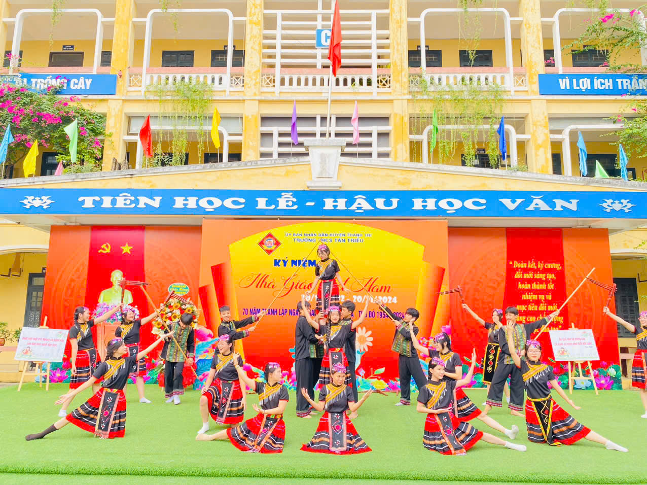 Sau đó, tiết mục múa “Người gieo mầm xanh” với tiếng hát trong trẻo của ca sĩ nhí 7a2 đã làm ai nấy phải đắm mình trong những giai điệu sâu lắng về sự nghiệp trồng người cao cả, chắp cánh ước mơ cho bao thế hệ tương lai.