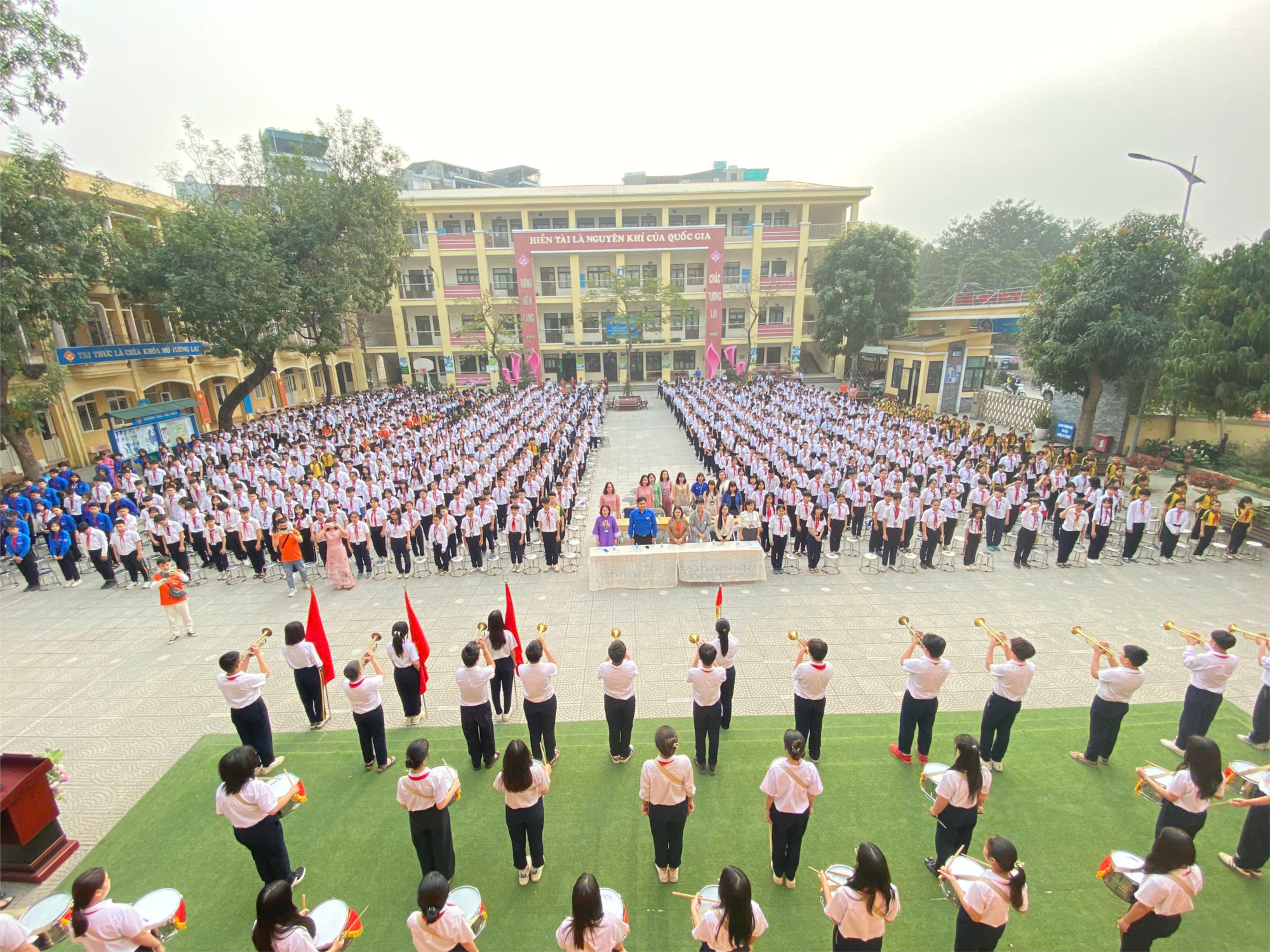 Sau nghi lễ chào cờ trang nghiêm, cô giáo Phạm Thị Hồng Yến - Bí thư Chi bộ, Hiệu trưởng nhà trường đã lên phát biểu khai mạc và phát động phong trào 5 tuần thi đua cao điểm của thiếu nhi cả nước. Đồng thời, cô cũng nhấn mạnh ý nghĩa quan trọng ngày kỷ niệm 50 năm Giải phóng miền Nam, thống nhất đất nước, khơi dậy lòng yêu nước và khát vọng cống hiến của thế hệ trẻ hôm nay.