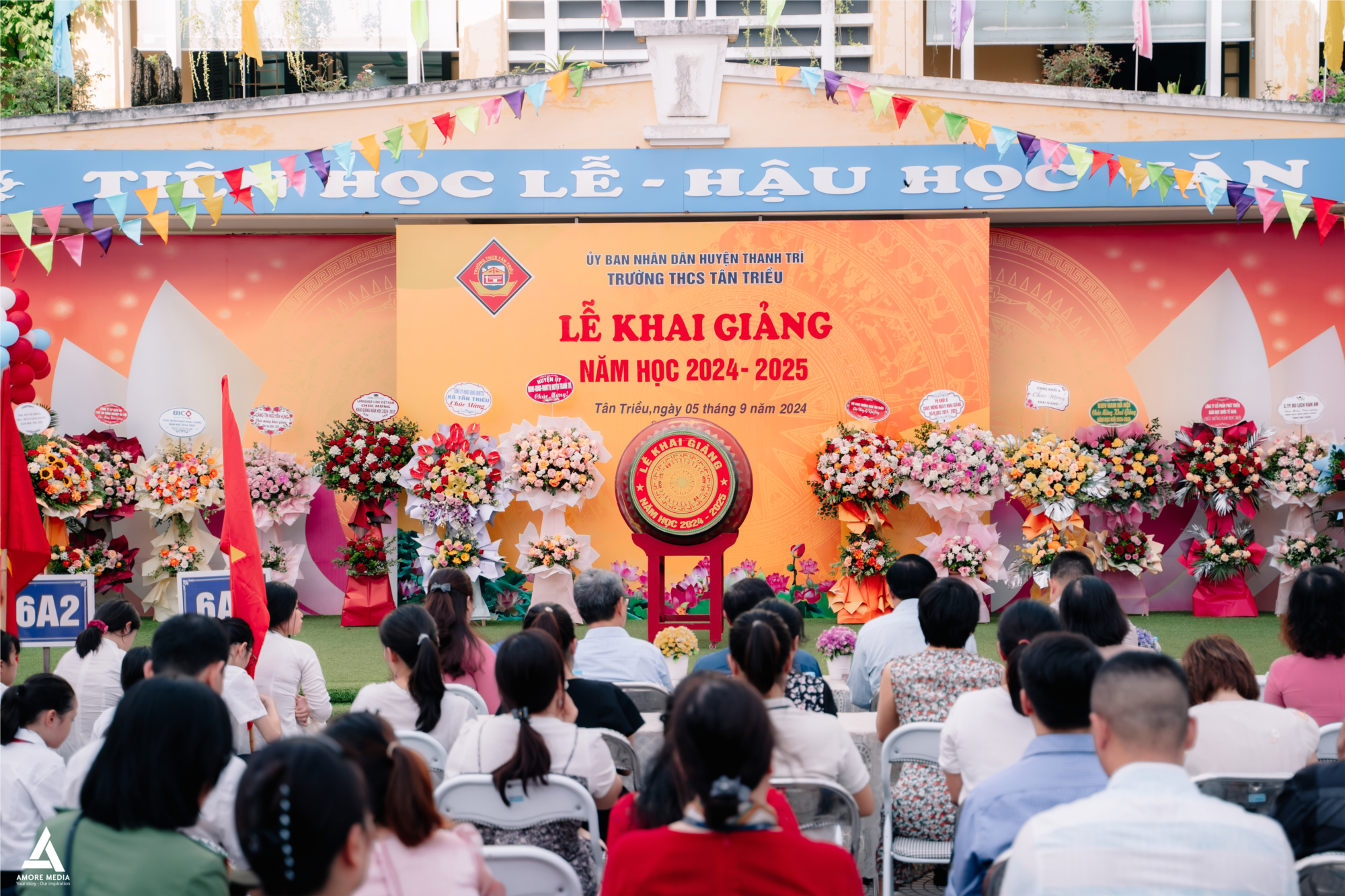 Nhà trường rất vinh dự được chào đón sự hiện diện của các vị khách quý đại diện cho lãnh đạo Đảng ủy, HĐND, UBND, các ban ngành, đoàn thể của xã Tân Triều, tổ dân phố, đại diện Chi hội phụ huynh các lớp, cùng với sự có mặt đông đủ của các đồng chí CB, GV, NV nhà trường và gần 1200 em học sinh yêu quý. Những lẵng hoa tươi thắm được gửi đến thay cho lời chúc mừng đã trang hoàng cho sân khấu thêm rực rỡ.