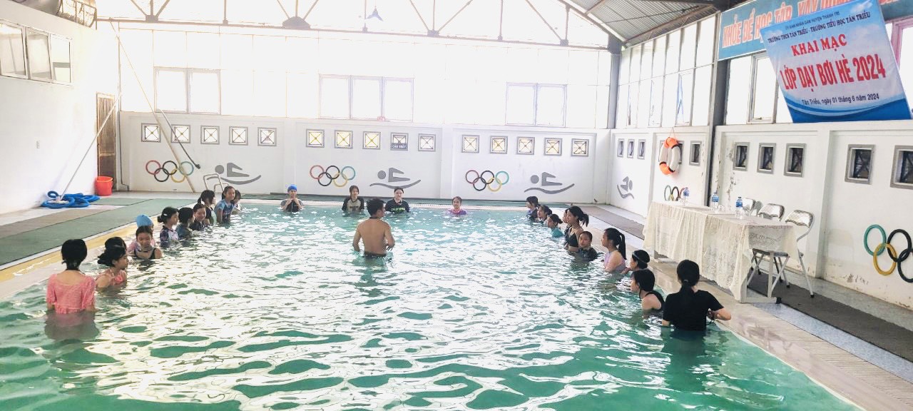 Thay mặt lãnh đạo các nhà trường, cô giáo Nguyễn Thị Phương – Phó HT, Chủ tịch công đoàn trường đã phát biểu khai mạc buổi lễ. Cô chúc mừng các bạn học sinh đã kết thúc một năm học với những thành tích đáng tự hào, cô nói rõ mục đích của lớp học bơi nhằm trang bị cho các em những kiến thức và kỹ năng cơ bản, giúp các em biết bơi trườn sấp, bơi ếch. Kết thúc khóa học, các em biết bơi đúng kỹ thuật 1 trong 2 kiểu trên dọc chiều dài 25 m của bể và được trung tâm TDTT huyện cấp chứng chỉ. Môn thể thao này không chỉ giúp các em phát triển thể chất, làm đẹp thể hình mà còn giúp các em thoát hiểm, có thể cứu giúp người khác trong những tình huống khi đối mặt với nước, giảm thiểu những tai nạn đáng tiếc do đuối nước gây ra. Đây là nhiệm vụ quan trọng mà lãnh đạo các nhà trường đặc biệt quan tâm nhằm giáo dục các em phát triển toàn diện và cũng chính là hoạt động thiết thực, ý nghĩa nhằm hưởng ứng cuộc vận động “Toàn dân rèn luyện thân thể theo gương Bác Hồ vĩ đại”.